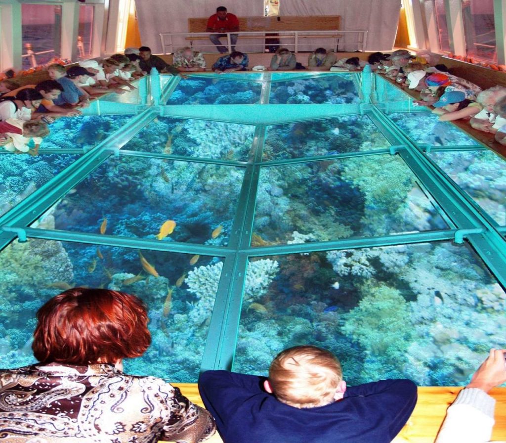 Посетив экскурсию на одной из лодок с прозрачным дном, у Вас появится возможность увидеть красоту подводного мира Красного моря. С их помощью Вы можете, не одевая акваланга, окунуться в этот чудесный мир, увидеть разнообразных рыб и кораллы невероятных цветов, форм и оттенков. А какие там обитают красивые рыбы! И Вы почувствуете себя частичкой этого подводного мира. Особенно интересно это будет маленьким детям и взрослым, которые не могут или не научились еще плавать.