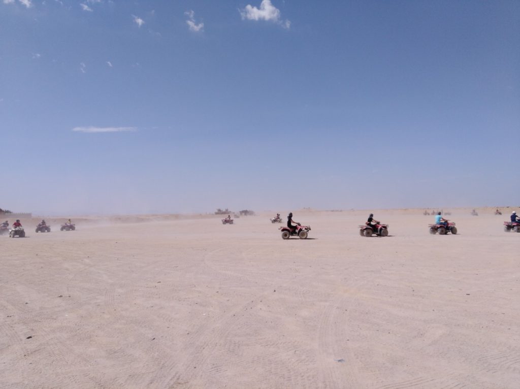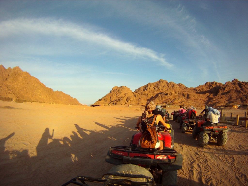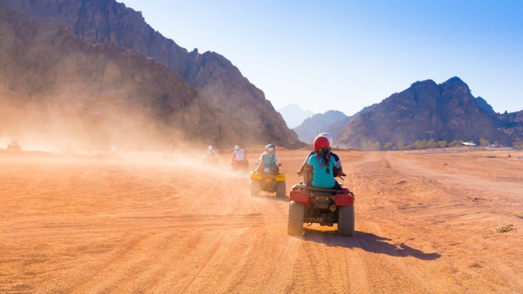 Это увлекательное приключение начнется с поездки на джипе в пустыню. Далее путешествие продолжится на квадроциклах, во время которого вы увидите настоящий мираж и сможете прокатиться с песчаных дюн. Впереди — запоминающая встреча с бедуинами, которые предложат путникам отдохнуть и отведать ароматного чая, катание на квадроциклах, багги (спортивном автомобиле) и верблюдах. В насыщенную программу также включено посещение мини-зоопарка, террариума.